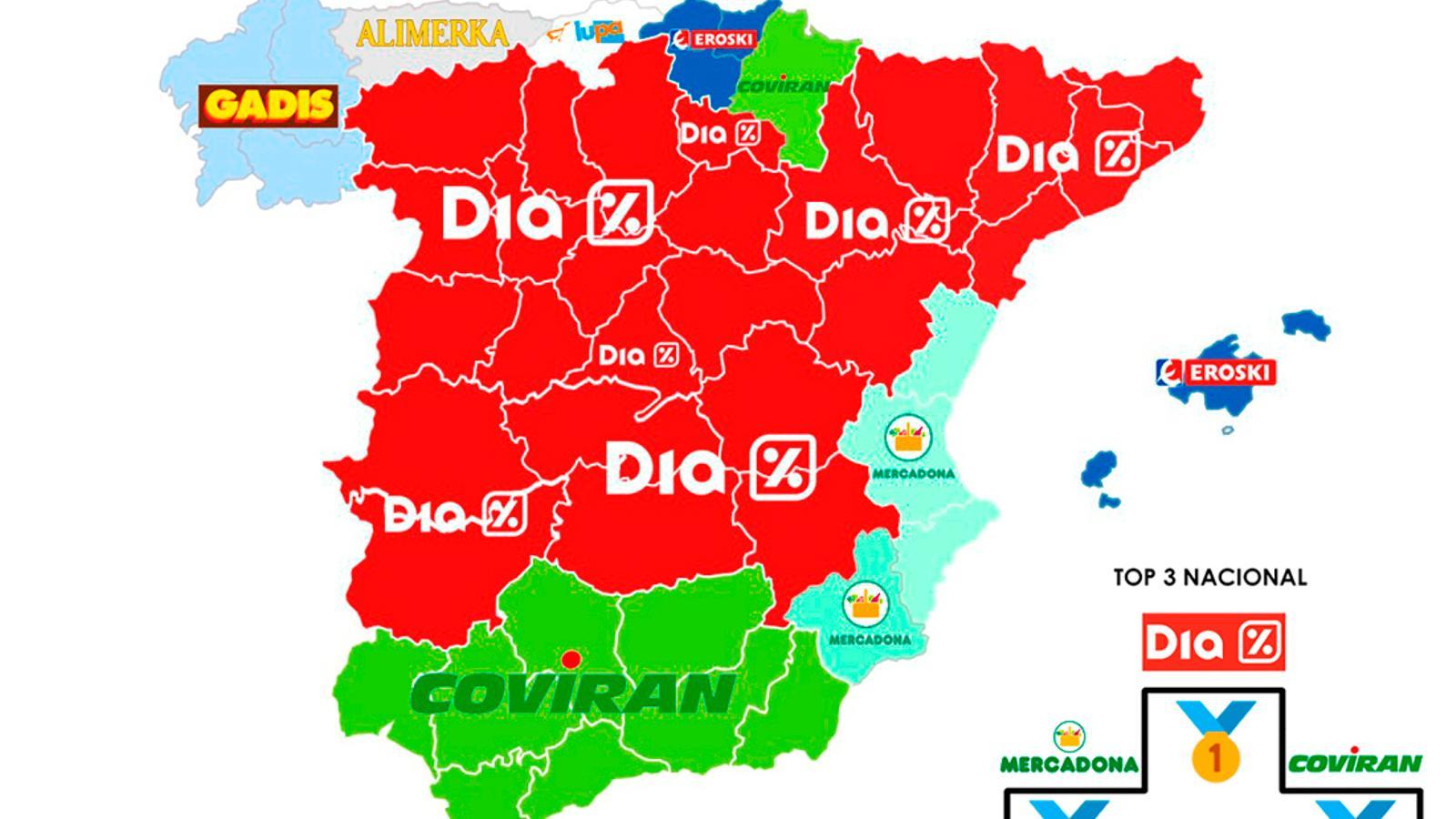 En el resto, las cadenas reinas de cada comunidad son en muchos casos compañías regionales y todas de capital español. Dia encabeza el ranking nacional, representando el 15,2% de todas los establecimientos, seguido por Mercadona, que representa el 8,8% y muy de cerca Covirán, con el 8,4%.