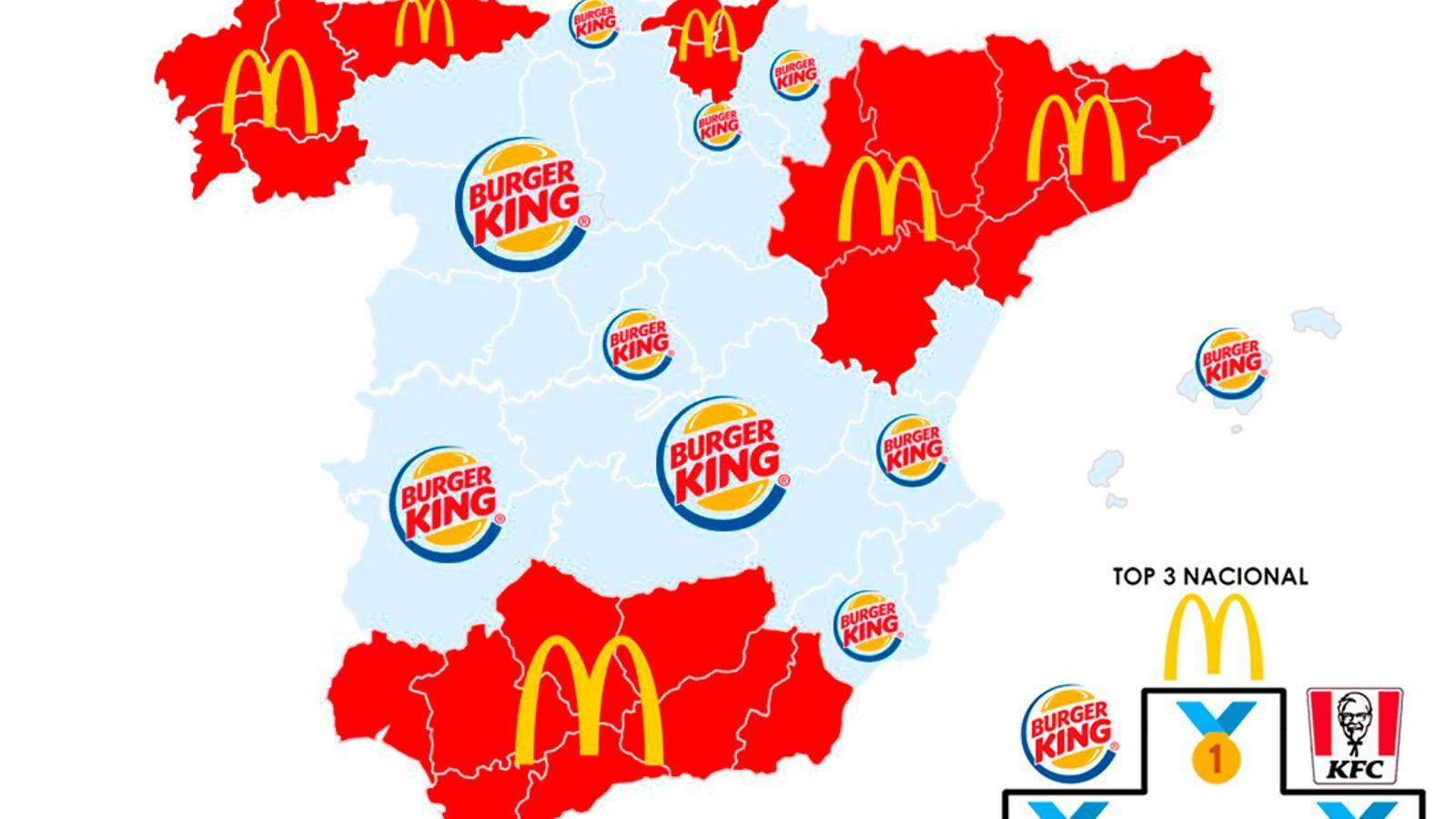 El estudio analiza también las marcas favoritas de comida rápida. La hamburguesa es, sin duda, la comida rápida preferida por los españoles. Las americanas Burger King y McDonald’s extienden su batalla hasta la península. Destaca la poca presencia de las grandes enseñas españolas del sector como Telepizza, que solo es favorita en Ceuta, o las marcas del grupo Restalia (100 montaditos, TGB, La Sureña…), ausentes en el mapa.
