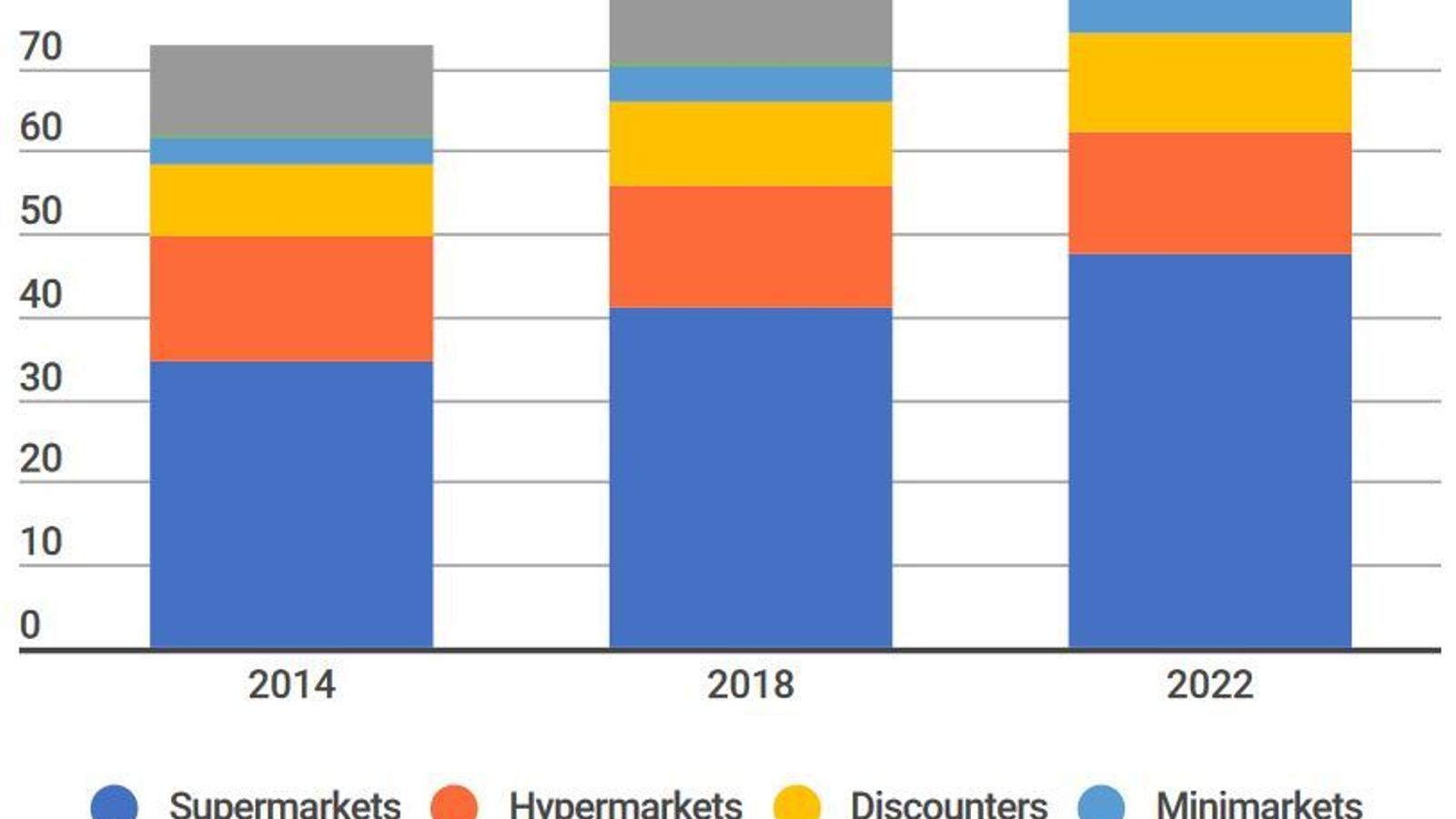 En cuanto al tipo de tienda, se prevé que para 2022-2023 haya un aumento considerable de supermercados y de tiendas discount, mientras que los hipermercados seguirán a la baja.