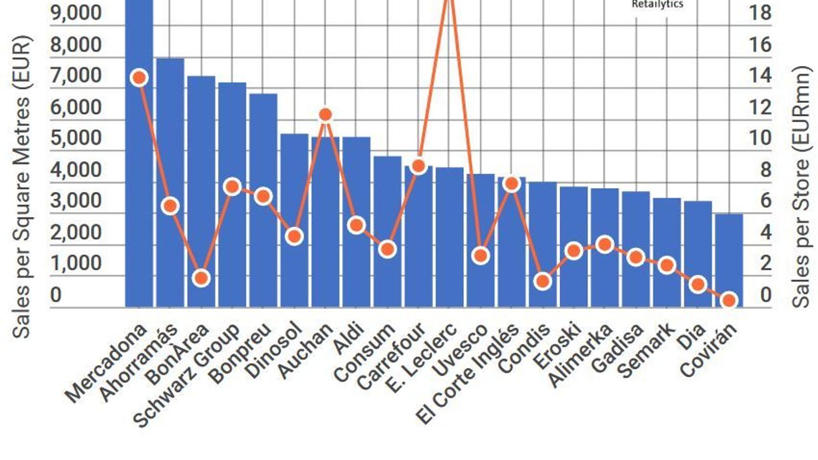 En cuanto a la productividad por metro cuadrado, Mercadona manda sobre los principales retailers del mercado español.