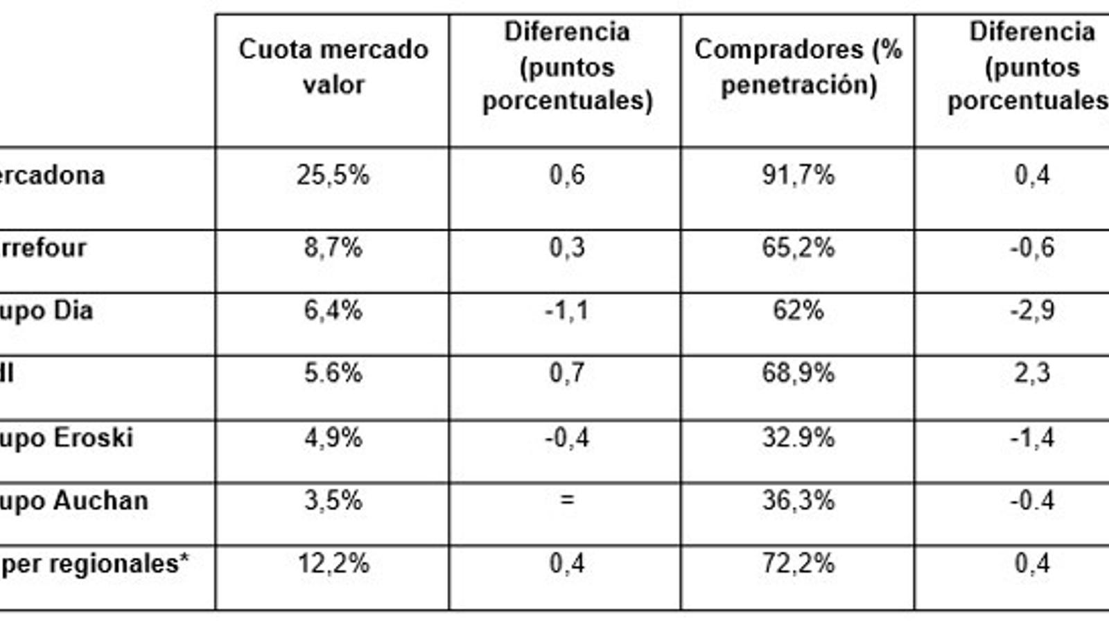 Mercadona no toca techo y consigue una vez más incrementar su posición en el mercado español. Según el Balance de la Distribución y el Gran Consumo elaborado por Kantar, los españoles se han gastado uno de cada cuatro euros (25,5%) de su presupuesto en gran consumo en la cadena de distribución liderada por Juan Roig.