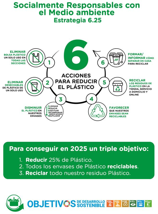 Esta hoja de ruta consta de seis acciones concretas para conseguir en 2025 un triple objetivo: reducir el 25% de plástico en sus envases, que todos los envases de plástico sean reciclables y reciclar todo el residuo plástico generado en sus procesos.