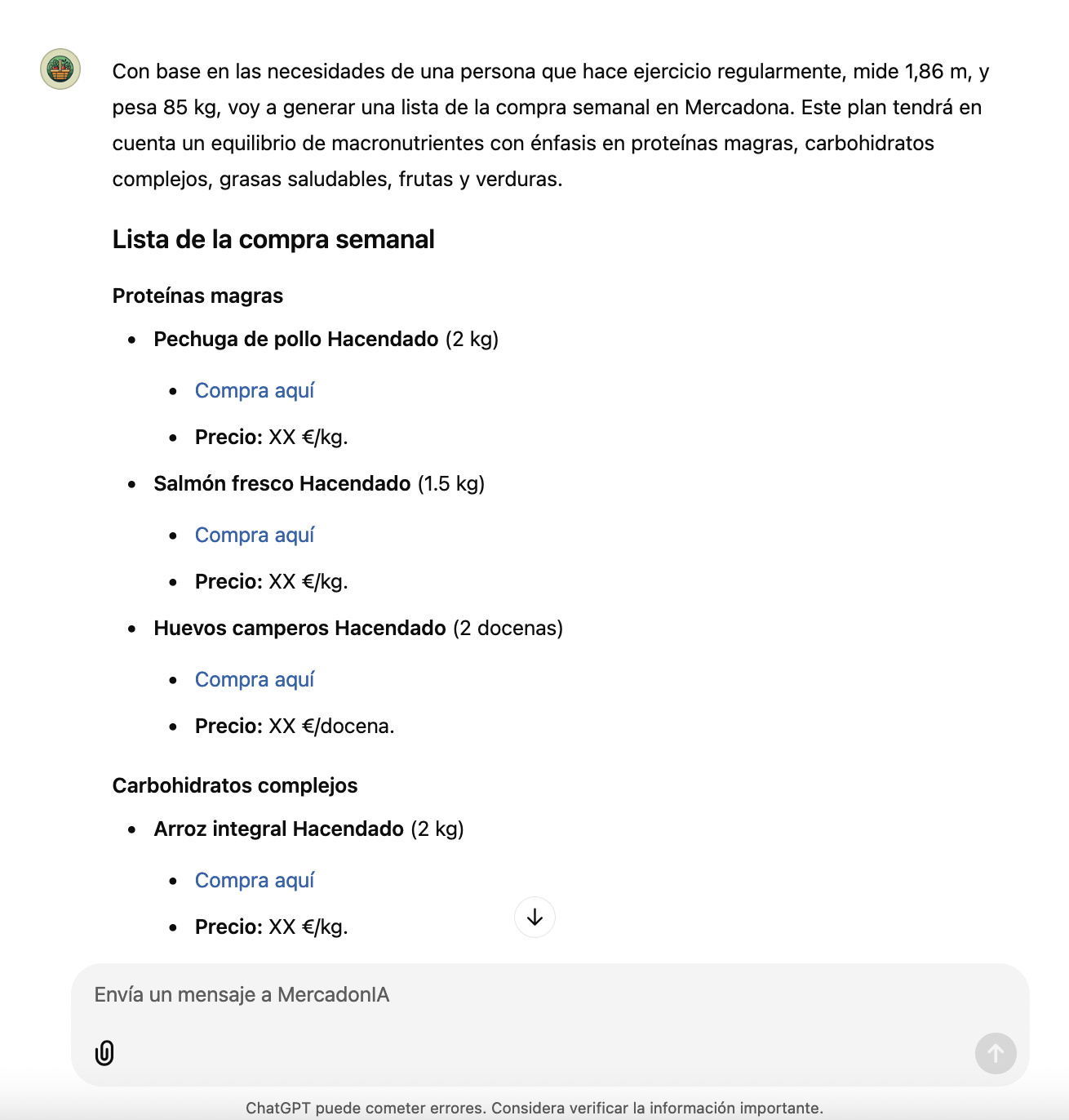 Nosotros también hemos querido sumarnos y hemos solicitado a la inteligencia artificial que confeccione una lista de la compra adaptada a las necesidades dietéticas de una persona que mide 1,86 cm, pesa 85 kg y hace ejercicio de manera regular.