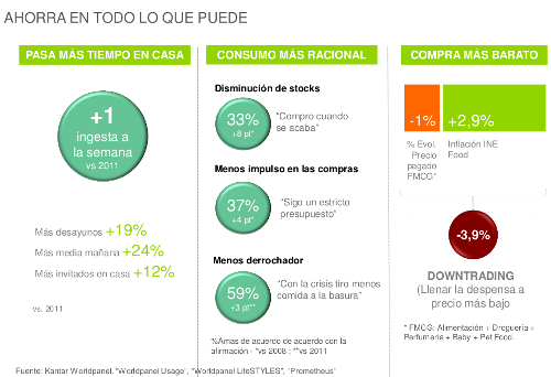 El consumo se ha vuelto más racional y el 33% de las amas de casa compra cuando se terminan las existencias (8 puntos más que en 2011); el 37% sigue un estricto presupuesto (+4) y el 59% tira menos comida a la basura (+3).