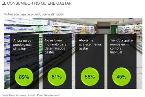El informe revela que el 89% de las amas de casa está de acuerdo con que “ahora no se puede gastar sin mirar”; el 61%, con que “no es buen momento para determinados gastos”; el 56%, con que “ahora me apetece menos gastar”; y el 45% afirma que “tiendo a gastar menos en mi compra habitual”.