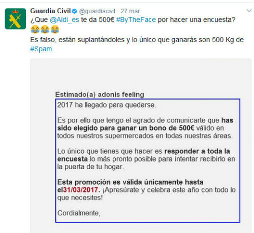 La Benemérita lo deja claro: “¿Qué @Aldi_es te da 500€ #ByTheFace por hacer una encuesta? Es falso, están suplantándoles y lo único que ganarás son 500Kg de #Spam”.