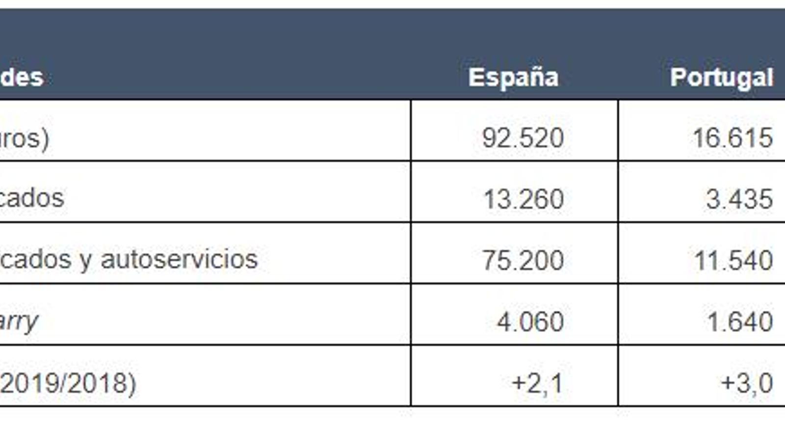 La facturación en el mercado ibérico de distribución con base alimentaria, considerando globalmente la actividad de hipermercados, supermercados y establecimientos cash & carry, se situó en 109.135 millones de euros en 2019, un 2,3% más que en 2018.