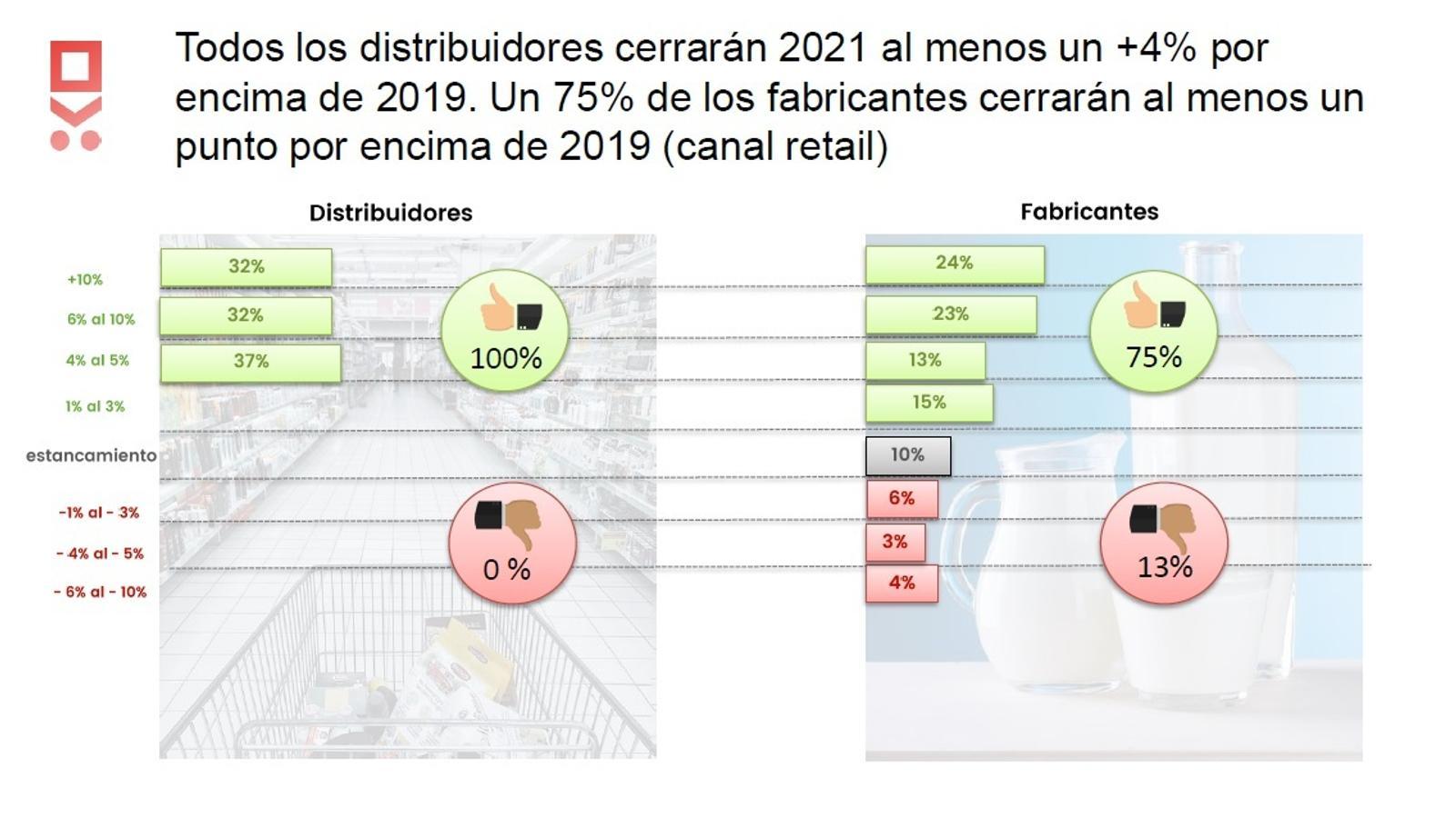 En concreto, señala el barómetro, el 37% de los distribuidores de gran consumo espera un crecimiento de entre el 4% y el 5%, mientras que el 32% prevé crecer entre el 6% y el 10% y el mismo porcentaje de compañías cuenta con mejorar su cifra de negocio por encima del 10% respecto al cierre del último ejercicio previo a la pandemia.