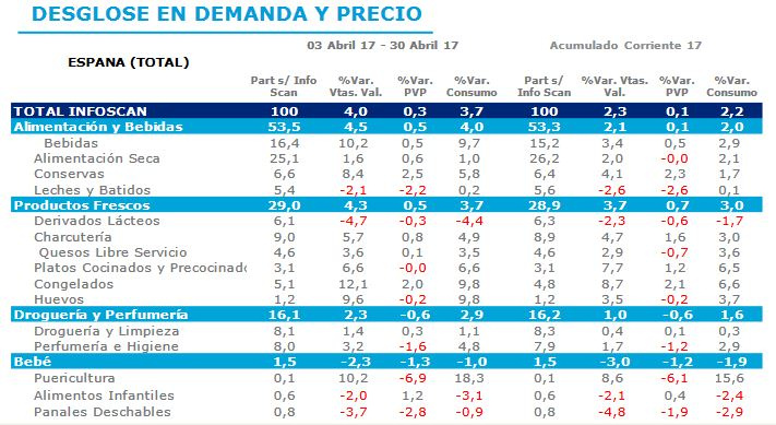 En el acumulado de los cuatro primeros meses de este 2017, las ventas en el gran consumo crecen el 2,3%. Cabe destacar que en abril el canal de perfumería y droguería moderna ha decrecido mucho, aunque en el acumulado es un canal que sigue contribuyendo más que la media al crecimiento del mercado.