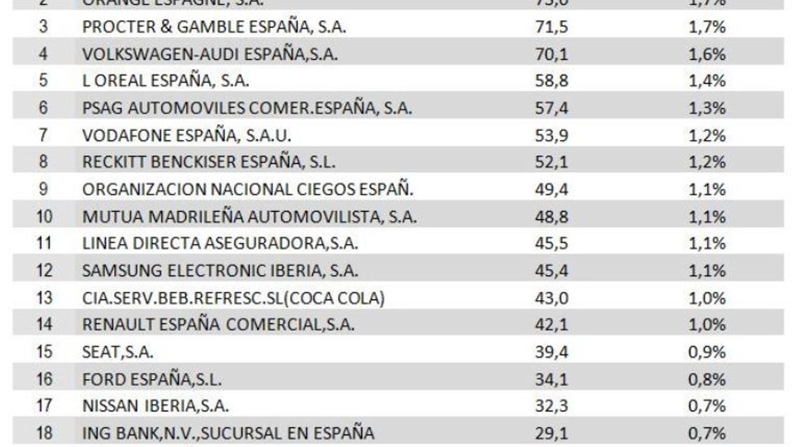 En el Top 5 de este ranking, después del gigante español de la distribución, otras dos firmas del sector de gran consumo se cuelan en la tercera y quinta posición. Se trata, respectivamente, de Procter & Gamble España, con una inversión de 71,5 millones de euros (1,7% del total) y L'Oréal España, con 58,8 millones de inversión que representa el 1,4% del total. Completan estos primeros puestos Orange (73 millones) y Volkswagen-Audi España (70,1 millones).
