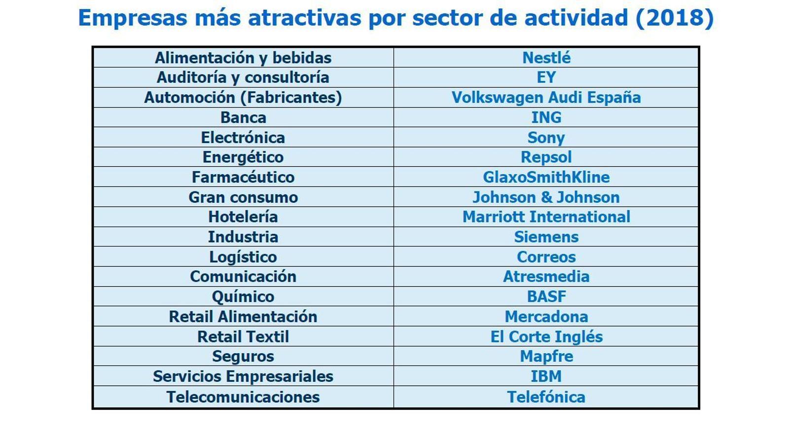 De vez en cuando salen informes sobre las empresas más atractivas para trabajar. El último llega de Randstad, que ha dado sus galardones a las compañías más sexys para trabajar en función de su sector de actividad. Con ellos, ha presentado su informe anual Randstad Employer Brand Research, que analiza las principales razones por las que un profesional elegiría una empresa para desarrollar su carrera profesional.