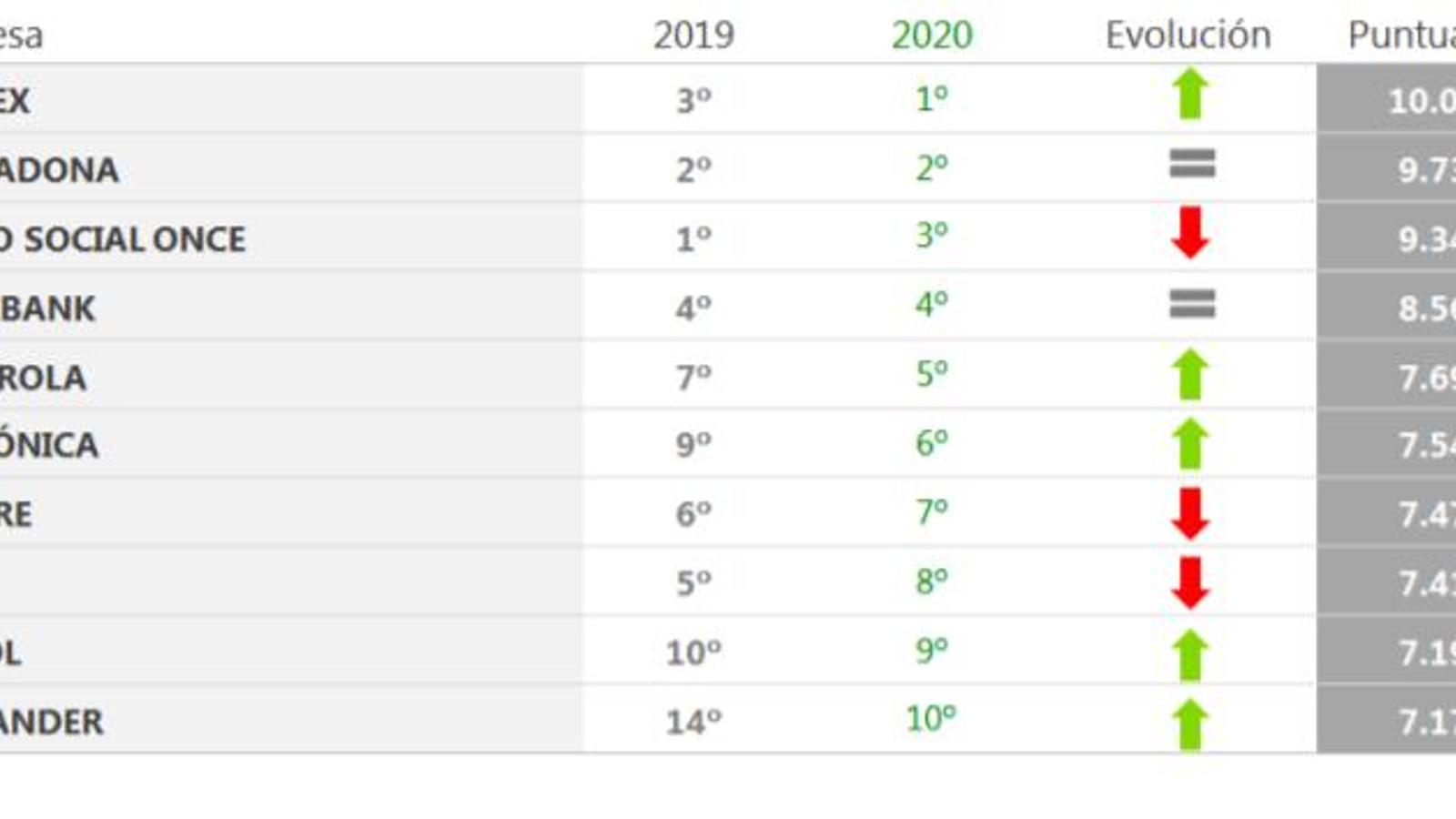 De este modo, Inditex, Mercadona y Grupo Social ONCE son, por este orden, las tres empresas más responsables y con mejor gobierno corporativo en España en 2020 según este ranking elaborado con un análisis de 10.082 encuestas, 5 evaluaciones y 12 fuentes de información.