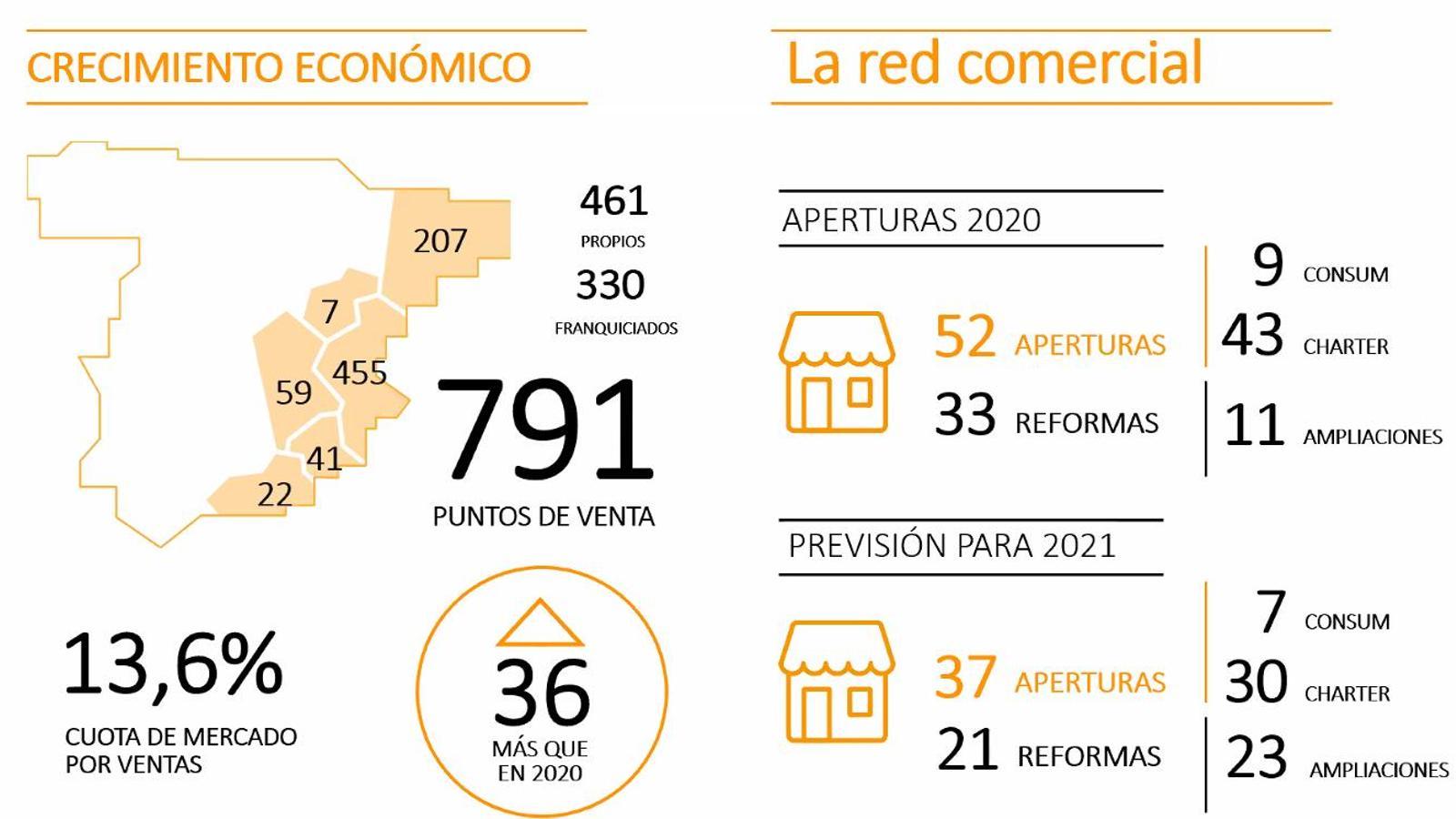 La Cooperativa ocupa el 6º puesto del ranking nacional de empresas de distribución, manteniendo su cuota por superficie en el 4,3% del mercado nacional, mientras que su cuota de mercado por ventas en su área de influencia se sitúa en el 13,6%. Además, en 2020, las ventas de la tienda online se incrementaron el 58%, hasta alcanzar una facturación de 44,5 millones de euros, estando presente en 229 poblaciones de las provincias de Valencia, Alicante, Castellón, Barcelona, Tarragona, Almería y Murcia.