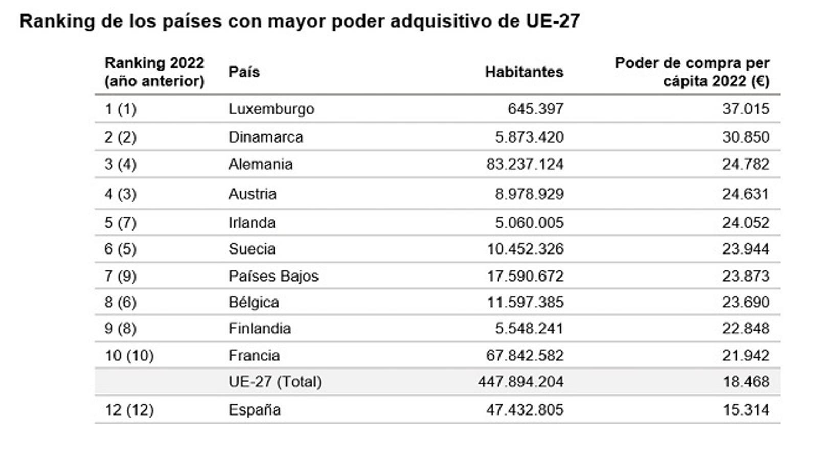 En cuanto al poder adquisitivo medio per cápita de los 27 países de la UE, alcanza los 18.468 euros, lo que supone un crecimiento nominal del 6,1%. Esta cifra llega tras un poder de compra casi sin cambios en 2020 en comparación con el año anterior y un crecimiento moderado del poder adquisitivo del 3,9% en 2021.
