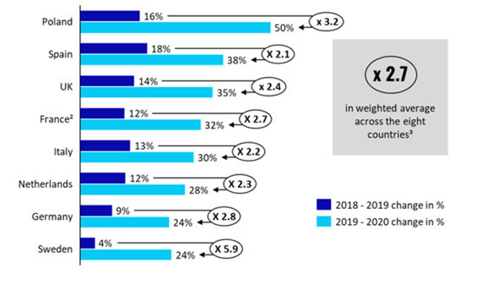 Los resultados de una encuesta de esta consultora a comercios independientes en Alemania y Francia a finales de 2020 muestran que aquellos que cuentan con un canal de venta online tienen más probabilidades de haber aumentado sus ventas que los puramente físicos. En concreto, en Alemania, el 51% de los comercios encuestados que vendían por Internet afirmaron que sus ventas habían aumentado en los últimos tres años, frente al 38% de los que no vendían por Internet. En Francia, el 53% de los encuestados que venden por Internet afirmaron que sus ventas habían aumentado en los últimos tres años, frente al 40% de los que no venden por Internet.