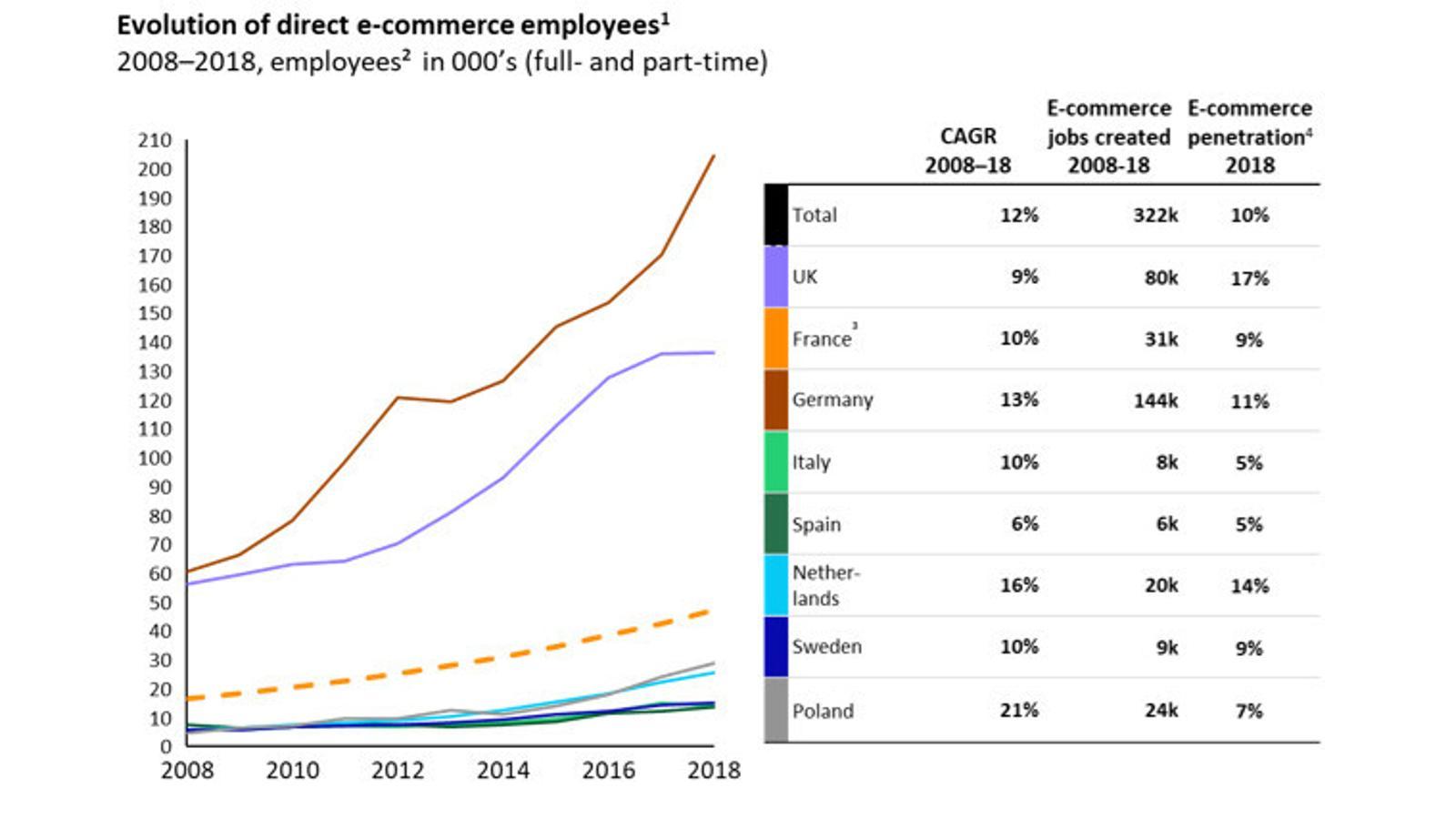 Así, el empleo directo en el sector minorista en los ocho países europeos analizados ascendía a 12,5 millones de empleos en 2018, de los cuales 480.000 (3,8%) eran en el ecommerce. Entre 2008 y 2018, se crearon 1,3 millones de empleos directos netos en el sector minorista en estos mercados. Los minoristas físicos añadieron un millón de empleos directos netos, o un crecimiento anual del 1%. Mientras, durante el mismo período, el número de puestos de trabajo directos netos creados por el ecommerce se duplicó con creces (un crecimiento anual medio del 12%) hasta alcanzar los 300.000 en 2018.