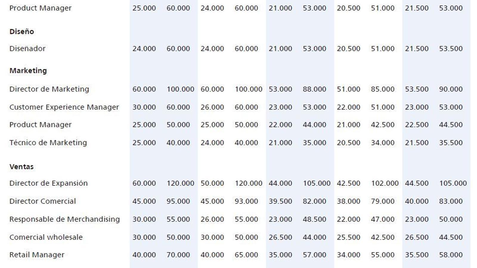 En la siguiente tabla se puede ver las escalas salariales que se mueven ahora mismo en el retail español: