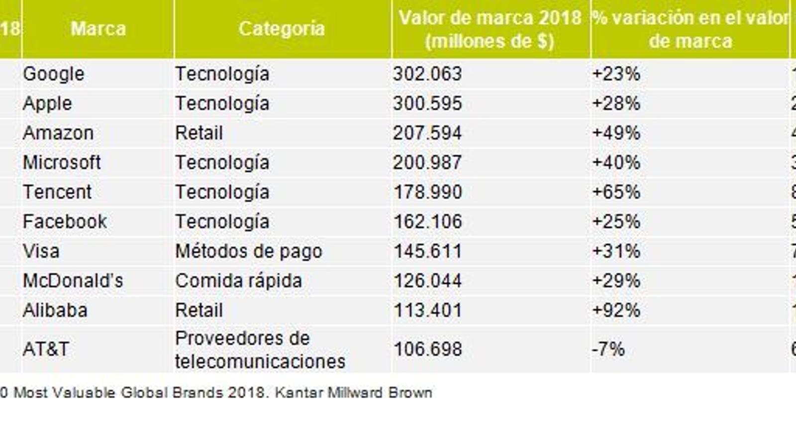 El ranking lo encabeza de nuevo Amazon, que ha crecido un 49% respecto al año pasado, alcanzando los 207.286 millones de dólares (más de 178.000 millones de euros). Este crecimiento le ha permitido, además, subir en el Ranking Global de las 100 marcas más valiosas del mundo, situándose tercero por delante de Microsoft. En este ranking general sigue a la cabeza Google, seguida de Apple. Completan el Top 10 Tencent, Facebook, Visa, McDonald's, Alibaba y AT&T. Como podéis ver, casi todas son empresas tecnológicas, con el retail representado por Amazon y Alibaba.