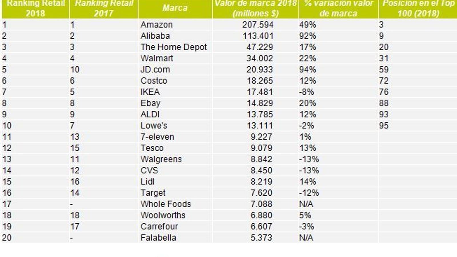 El ranking de retail cuenta este año con dos nuevas entradas. Por un lado, la marca estadounidense Whole Foods, en la posición 17 con un valor de 7.088 millones de euros (6.000 millones de euros=. Además, la marca chilena Falabella logra incorporarse al lugar 20 del ranking con un valor de marca de 5.373 millones de euros (4.600 millones de euros).