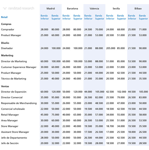 En la siguiente tabla, se especifican todos los salarios que pueden cobrar los diferentes responsables que trabajan en el retail, clasificados en las cinco ciudades principales de España: Madrid, Barcelona, Valencia, Sevilla y Bilbao.