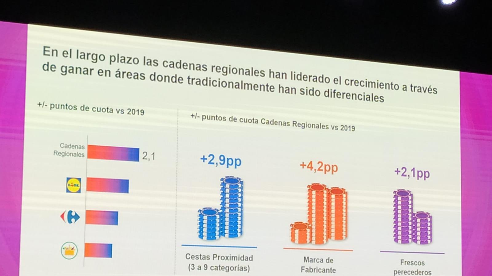 Ejemplo de esto son las cadenas de supermercados regionales, que han liderado el crecimiento a través de concentrarse en áreas que forman parte de sus fundamentos. Su cuota en cestas de proximidad se ha incrementado el 2,9% desde 2019; su cuota en marcas de fabricante, el 4,2%; y su cuota en frescos perecederos, el 2,1% (ésto último, en buena medida, gracias al trasvase del canal tradicional).