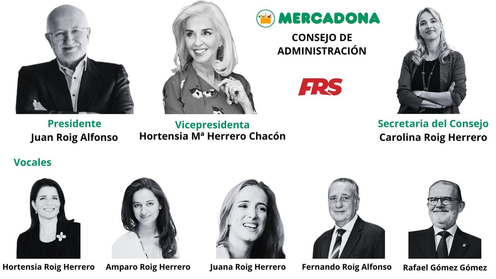 De los cinco vocales que completan el Consejo de Administración de Mercadona cuatro son miembros de la familia: Hortensia, Amparo y Juana Roig Herrero, hijas del matrimonio; y Fernando Roig Alfonso, hermano de Juan Roig y presidente y máximo accionista del Villarreal, club de fútbol de primera división, y de la empresa de cerámica Pamesa, siendo propietario del 9% de las acciones de Mercadona.