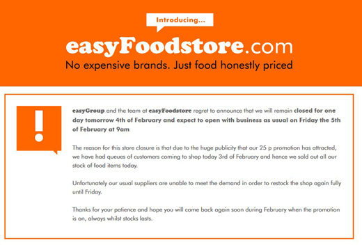 En la página web de la tienda se publicó el siguiente mensaje: "easyGroup y el equipo de EasyFoodstore lamentan anunciar que la tienda va a permanecer cerrada durante un día y podrá abrir este viernes por la mañana". "Desafortunadamente", indican los responsables del supermercado, "nuestros proveedores son incapaces de satisfacer la demanda que se ha generado".