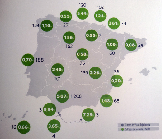 Mucho por hacer, por otro lado, en comunidades muy pobladas como son Madrid y Cataluña. En la primera, Covirán tiene 76 supermercados (uno por cada 85.000 habitantes), para llegar a una cuota de mercado del 0,58%, porcentaje a mejorar en uno de los puntos con más competencia de España. Mientras tanto, en Cataluña solo cuenta con 24 súper (uno por cada 300.000 habitantes), llegando a una pobre cuota de mercado del 0,08%. En la Comunidad Valenciana, donde manda Mercadona, Covirán tiene 36 supermercados (0,20% de cuota).