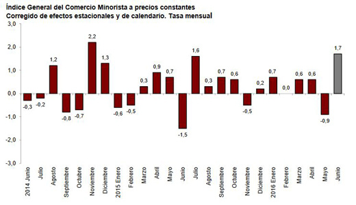 En cuanto a la tasa mensual, las ventas del comercio minorista aumentaron un 1,7% en junio respecto a mayo, su mayor repunte mensual desde noviembre de 2014.