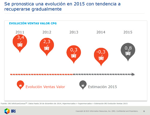 2015 ofrece buenas perspectivas para el consumo. En concreto, Iri prevé que las ventas en valor en súper e hiper crezcan el 0,8%. 2014 fue un año “complicado y turbulento”, según ha afirmado Eva Vila, directora general de Iri, en el marco de las jornadas de Aces. La demanda creció el 0,2%, pero los precios bajaron el 0,5%. Al menos cuatro de cada diez euros vendidos corresponden a la marca de la distribución (MDD), que ha comenzado a decrecer. En lo que respecta a las marcas de los fabricantes (MDF), el pasado ejercicio fue de recuperación, pero a costa de bajadas de precios y promociones, porque sus ventas se sitúan aún por debajo de 2008. Juega en su contra la marcha de muchos inmigrantes, en su conjunto grandes clientes de las primeras marcas.