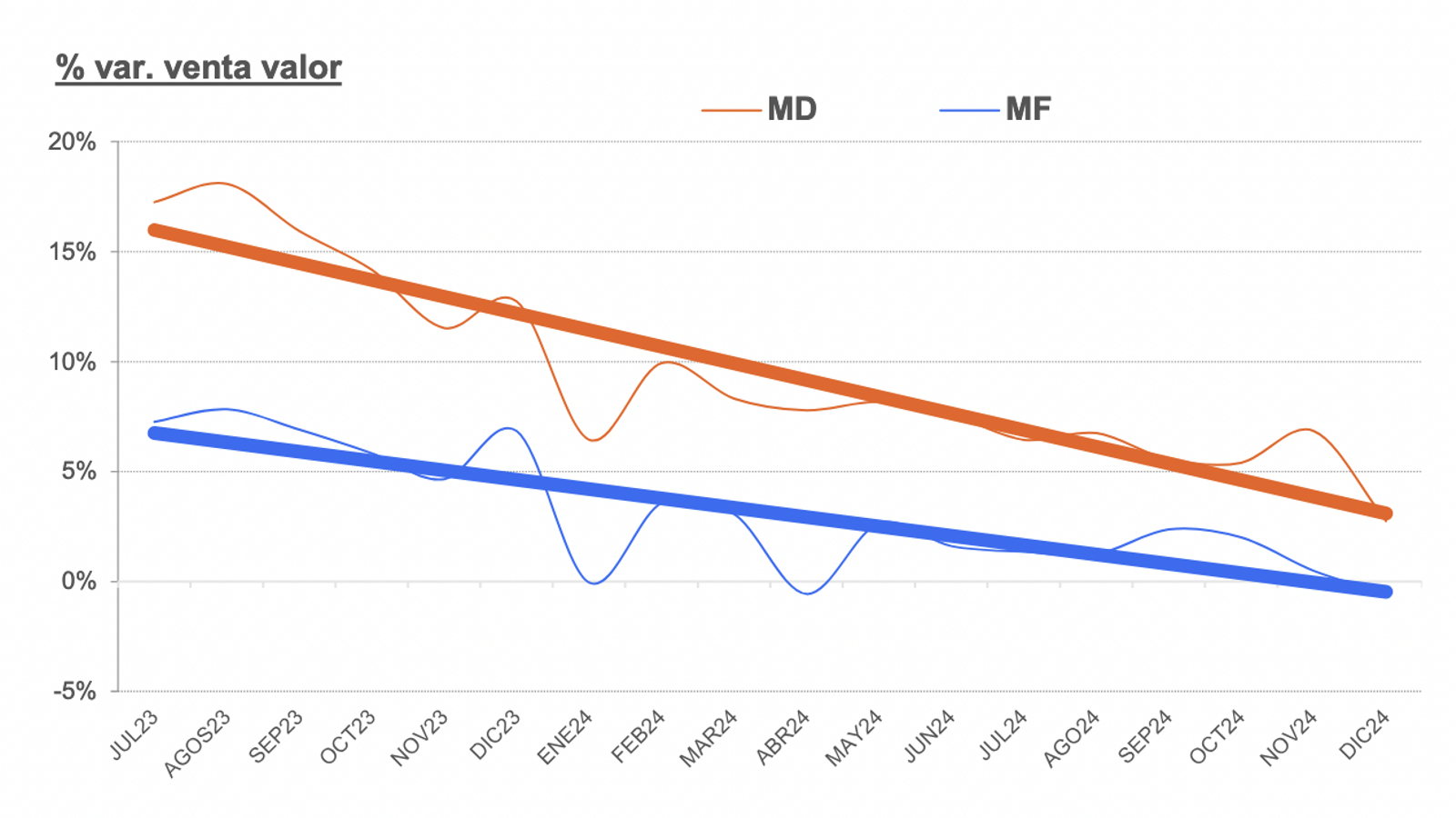 Entre 2020 y 2023, la MDD creció siempre en el entorno del 2% anual; ahora se sitúa en el 1,3%. Ambas, MDD y MDF, caen en valor, pero la MDD ha caído más desde mediados del pasado año (ver gráfico arriba).