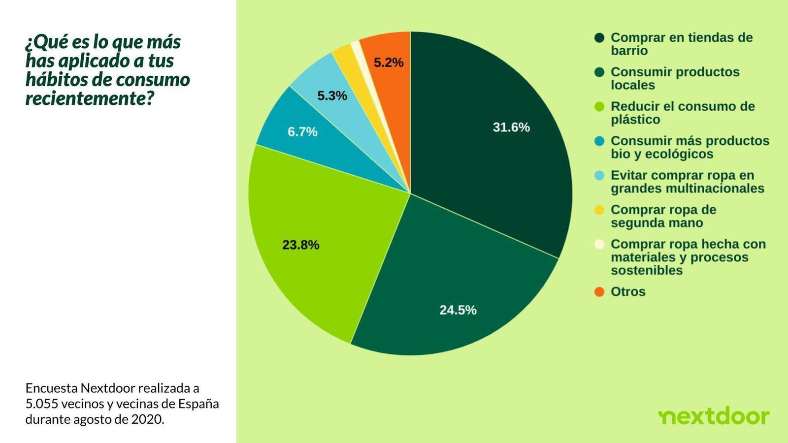 Los consumidores indican además cuál ha sido el principal cambio que han experimentado en sus hábitos de consumo. El 31,5% señala el hecho de apostar por comercios locales como la mayor diferencia en sus compras, mientras el 24,5% dice haber apostado más por el consumo de productos locales, y el 23,8% se esfuerza en reducir el consumo de plástico en sus compras.