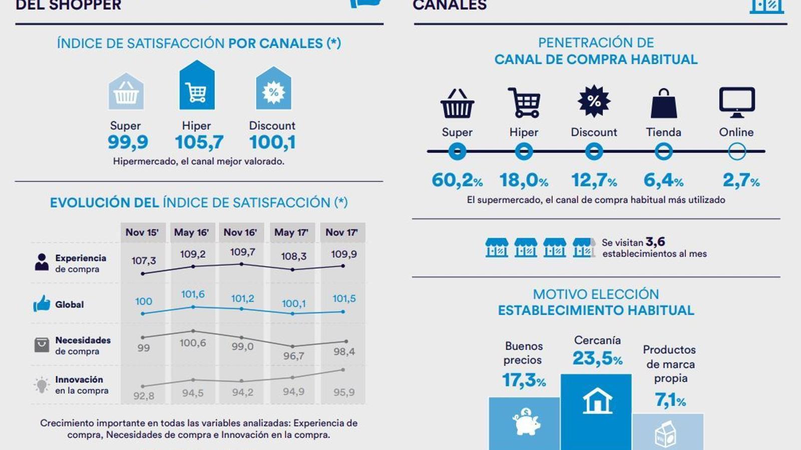 Por canales, el hipermercado es el mejor valorado con un índice del 105,7, seguido del discount con un 100,1 y del supermercado con un 99,9. Mejoran todos los índices de satisfacción de forma notable, situando la satisfacción global en 101,5 puntos.