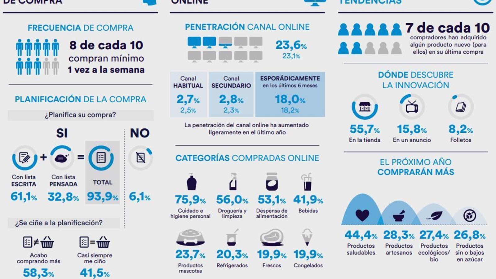 Ocho de cada diez consumidores compran como mínimo una vez por semana. Casi el 94% asegura planificar su compra o bien a través de una lista escrita o pensada, si bien, más del 58% de los compradores asegura que siempre acaba comprando más.