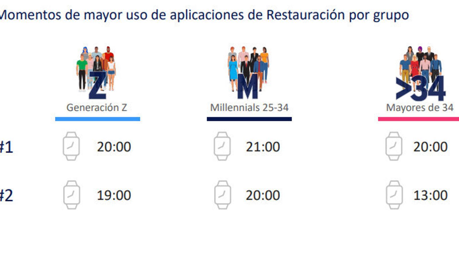 Asimismo, la generación Z y los millennials utilizan las aplicaciones de comida rápida para las cenas (se deduce un mayor componente social en el driver de consumo). Sin embargo, los mayores de 34 años amplían también al horario de comidas.