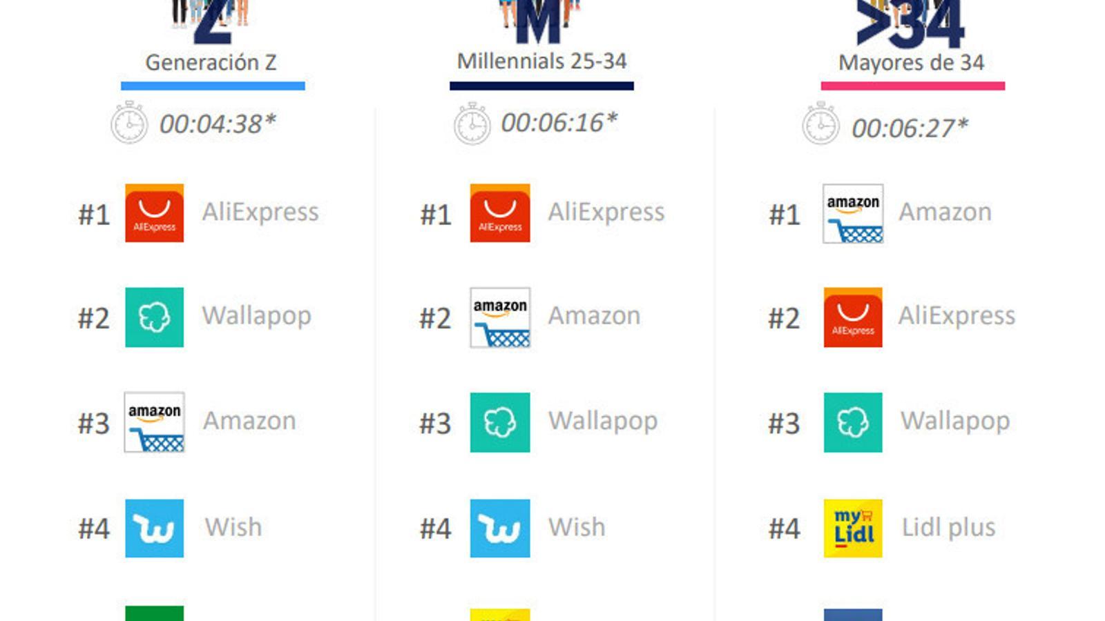 Incluyendo en el análisis de este sector a las aplicaciones de compras generalistas y los supermercados, hay que destacar las posiciones de AliExpress, Amazon y Wallapop que compiten por los las tres primeros puestos en el ranking según el grupo de edad.