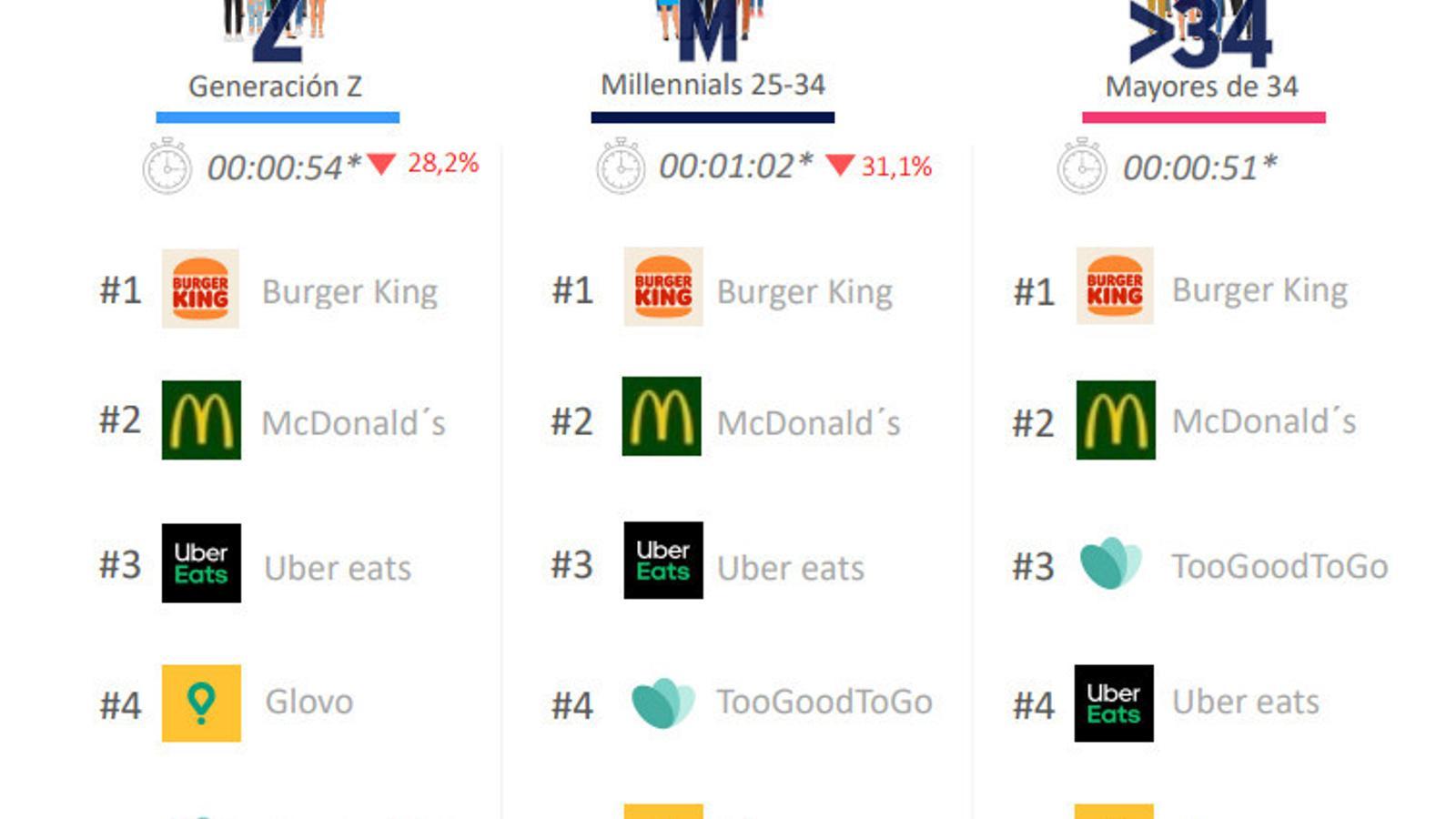 En la categoría de restauración y delivery se sitúa en cabeza la app de Burger King (cuya cuota de mercado es muy similar entre las tres generaciones estudiadas). Le sigue su principal competidor: McDonald's.