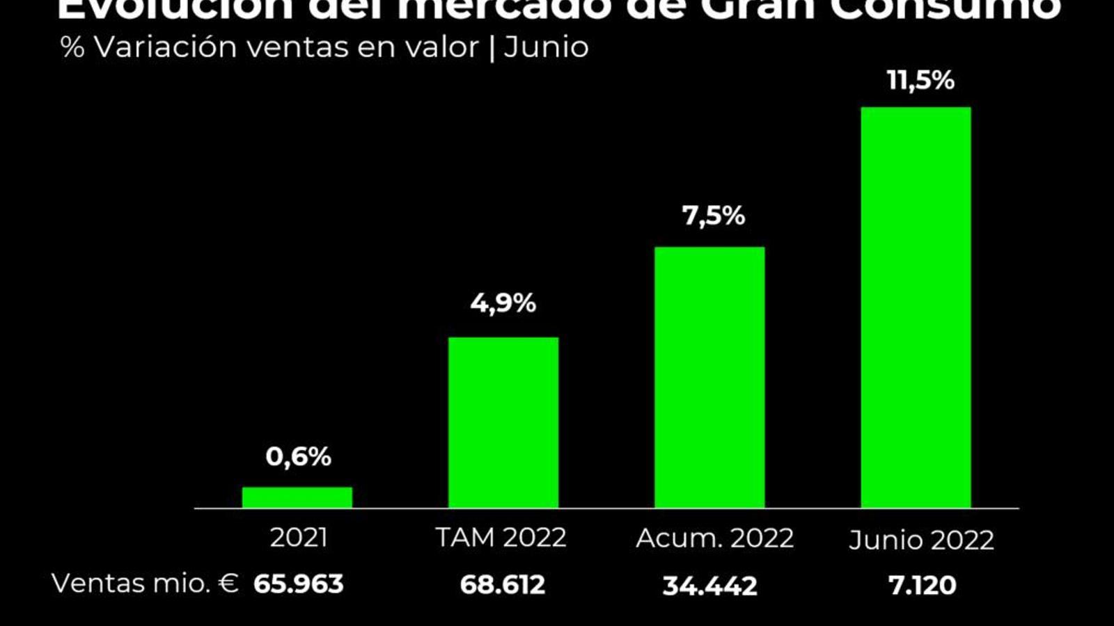 En este sentido, la alimentación es el segmento que registró el mayor desembolso de los españoles con un crecimiento del 12,9% de las ventas en valor en junio de 2022, respecto al mismo periodo del año anterior. Esta cifra es aún más acusada en comparación con las ventas en volumen que se mantuvieron igual que el año anterior, con un crecimiento de tan solo el 0,1%.
