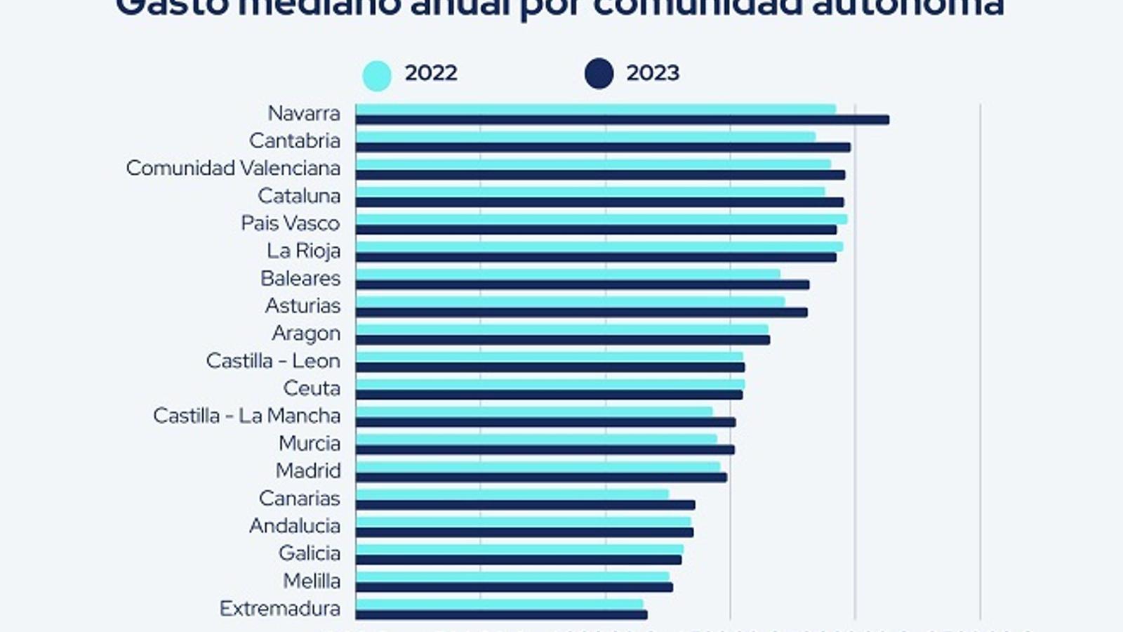 El análisis evidencia además significativos contrastes entre las comunidades con mayor y menor gasto. Si en el caso de Navarra la media de gasto es de 2.137,91 euros al año, Extremadura se posiciona en el extremo opuesto, con 1.168,91 euros.