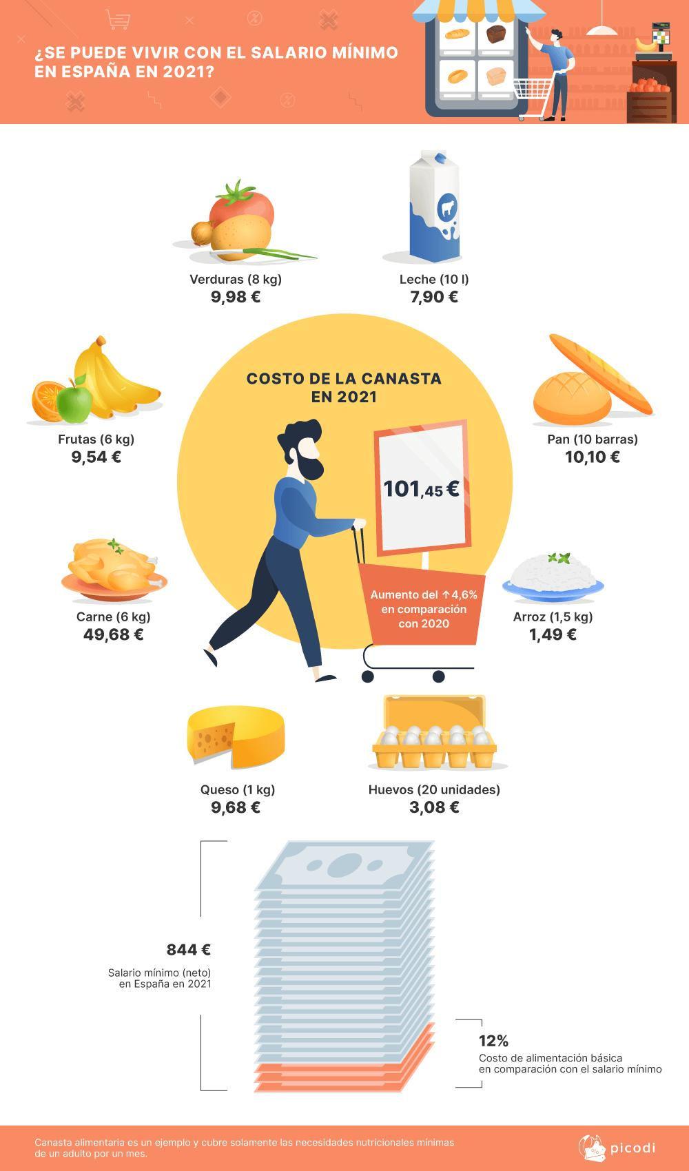 ¿Cómo ha afectado la pandemia a la cesta de la compra de los que ganan menos en España? Pues bien, los gastos en la cesta básica representan el 12% del sueldo mínimo neto este año, mientras que la misma compra de productos constituía el 11,9% del salario mínimo durante 2019 y a principios de 2020. Esto significa que los precios en España aumentaron más rápido que el salario mínimo, según revela un estudio de Picodi.