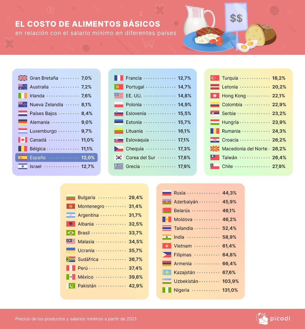 La mejor relación entre los precios de los alimentos y el salario mínimo se encuentra en Gran Bretaña, Irlanda y Australia, ya que en estos países, la cesta básica supone alrededor del 7% del salario mínimo. En otros, como Uzbekistán o Nigeria, el salario mínimo es tan bajo que no cubre ni siquiera los costes de la compra básica.
