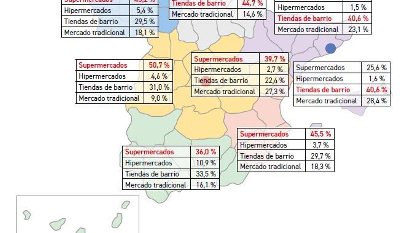 - Manda el supermercado - La mayoría de los españoles elige el súper como la tienda a la que suele acudir para comprar alimentos y bebidas. En la cornisa cantábrica y noreste de España las tiendas de barrio son las preferidas.