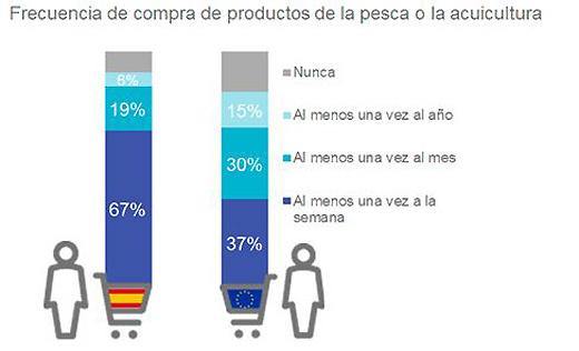 España es el país europeo con un mayor consumo mensual de pescado en los hogares: un 92% de los españoles consume mensualmente productos derivados de la pesca y la acuicultura, seguido por los suecos (90%) y los daneses (86%). Cuando se pregunta acerca del consumo de estos productos fuera del hogar, la cifra disminuye y solo un 19% de los españoles declara consumirlo de manera semanal en un restaurante o en un bar, aunque un 46% sí afirma consumirlos fuera del hogar al menos una vez al mes.