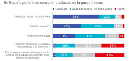 Los españoles somos principalmente consumidores de producto fresco, muy por encima de la media europea: el 65% de los españoles que compra productos procedentes de la pesca o la acuicultura se decanta a menudo por productos frescos, frente al 34% de los europeos. Por otro lado, nuestro nivel de compras habituales de productos enlatados (40%) es superior a la de productos congelados (31%). Los productos ahumados, en salazón, deshidratados o en salmuera no parecen gozar de mucho éxito en el mercado español, tampoco los productos empanados o platos preparados de esta categoría: 7 de cada 10 españoles que compran productos procedentes de la pesca o la acuicultura no los acostumbran a adquirir (lo hacen "pocas veces" o "nunca").