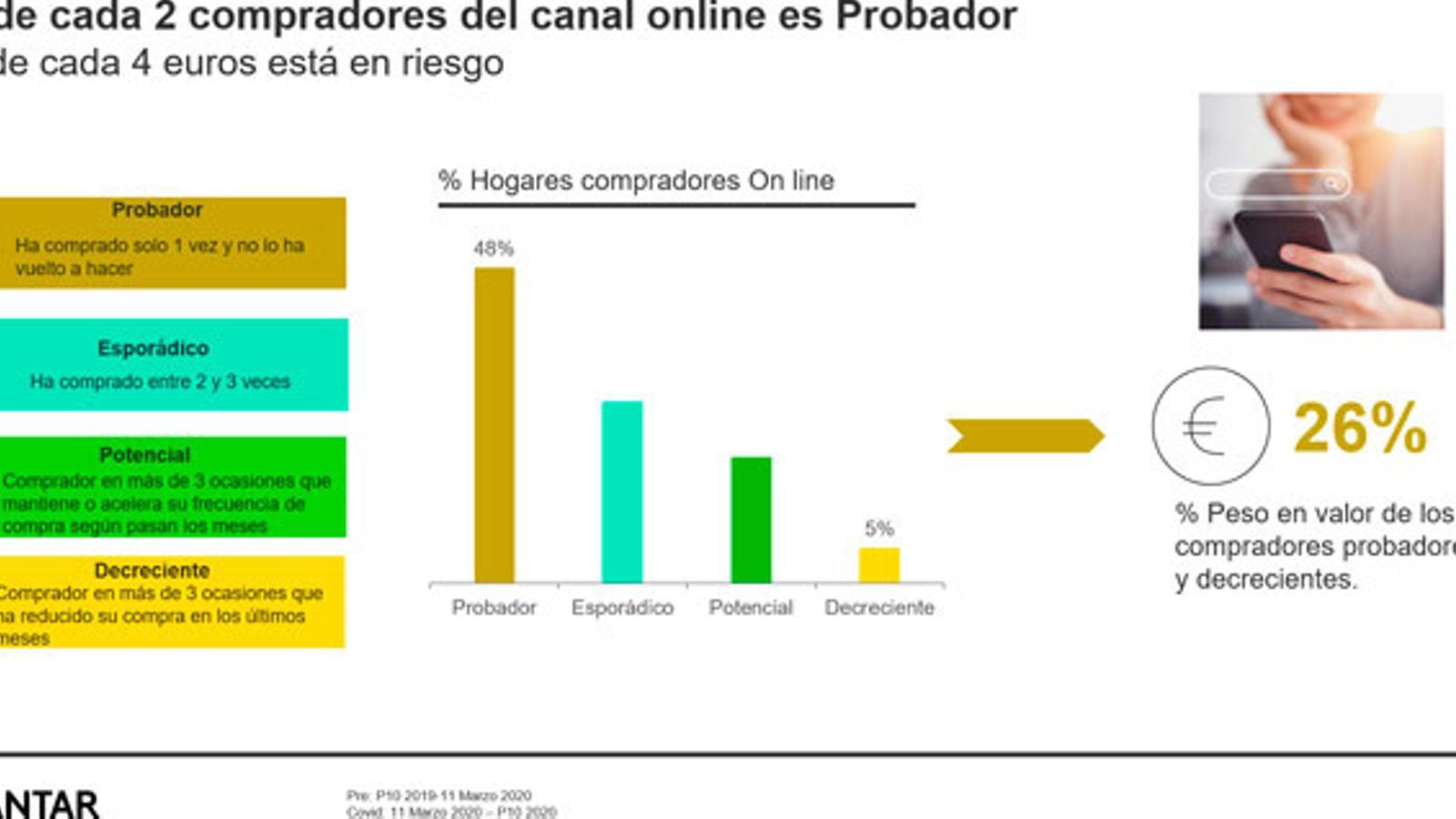 En cuanto al perfil del consumidor online, Kantar considera que 1 de cada 2 compradores (el 48%) corresponden a la categoría de probador, es decir, clientes que sólo han realizado una compra en el canal online y no han vuelto a hacerlo por segunda vez. En términos de valor, 1 de cada 4 euros gastados en este canal está en riesgo.