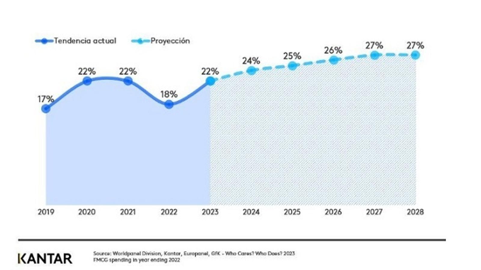 El segmento de compradores preocupados por la sostenibilidad registró en 2023 un repunte hasta representar el 22% de los shoppers, en comparación con el 18% en 2022 y el 22% en 2021, según un estudio de Kantar Worldpanel. Estos consumidores gastan cada año casi 500 millones de dólares en el mercado de productos de gran consumo, y se prevé que esa cifra alcance 1.000 millones de dólares en 2027.