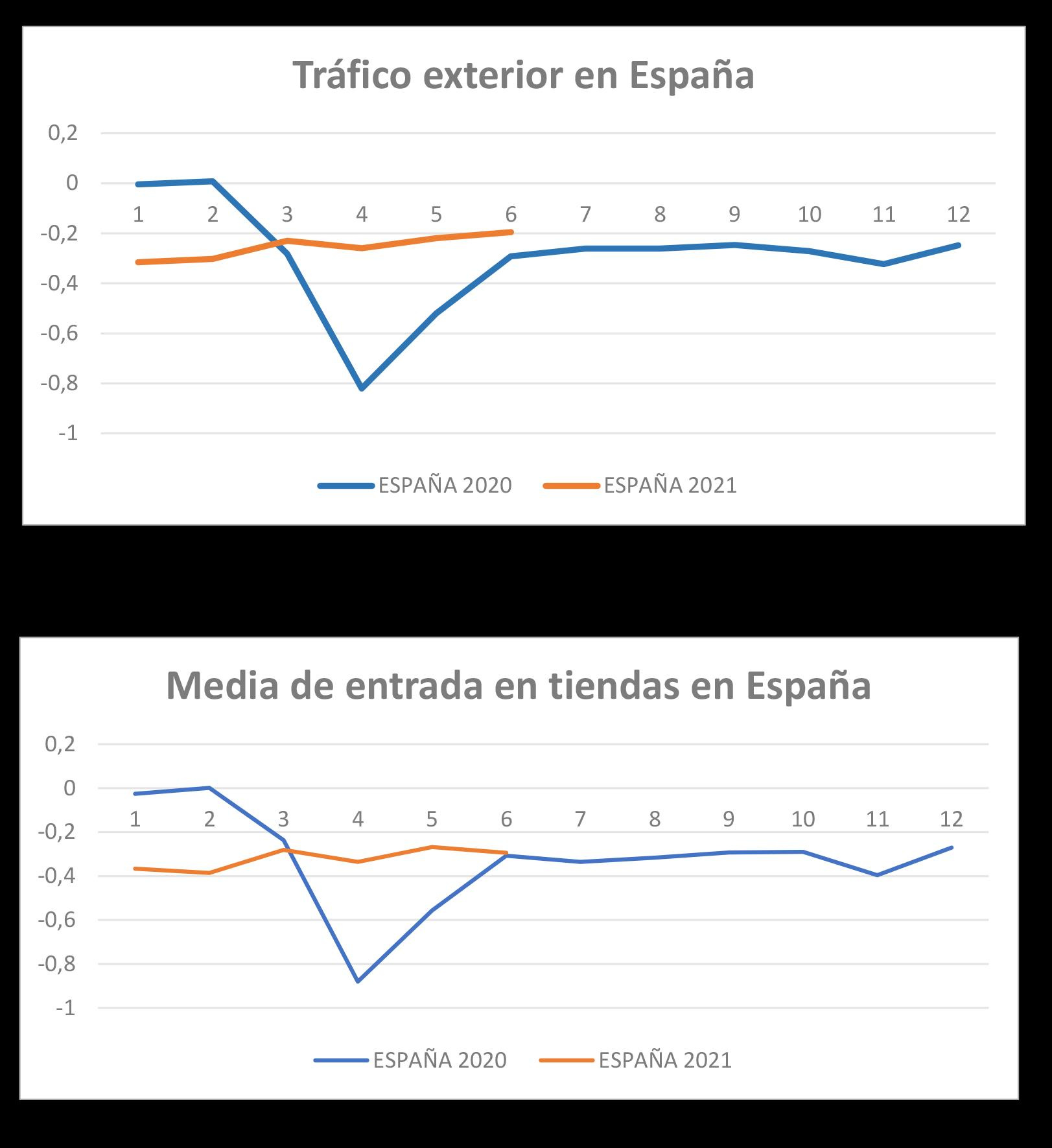 En estos momentos y según datos propios recogidos y elaborados por TC Group Solutions, las cifras de tráfico exterior durante el mes de junio han subido en el conjunto de España el 9% en relación al mismo mes del año pasado. Sin embargo, el incremento de movimiento en las calles no está teniendo un impacto directo tan claro en las entradas en tienda – y por tanto, en la posibilidad de generar ventas –, ya que la mejoría en este caso es tan sólo del 2% si se compara con junio de 2020.
