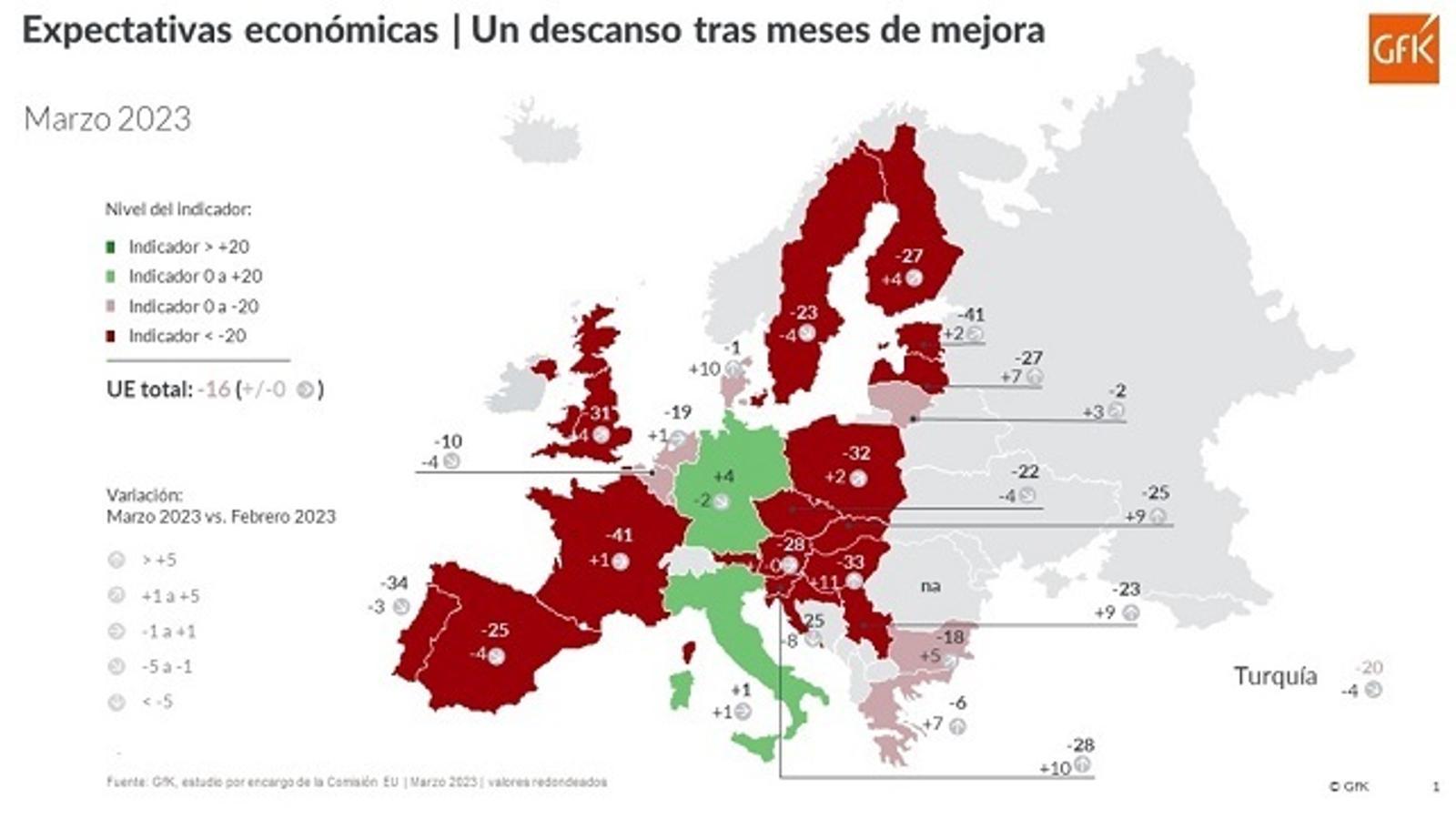 En el caso de las expectativas económicas de los europeos, estas se mantienen sin cambios en comparación con el mes anterior, registrando -16 puntos. Solo dos países muestran previsiones positivas: Alemania (+4), por segunda vez consecutiva, e Italia, que acaba de superar por poco la barrera de los cero puntos. Reino Unido, a pesar de tener uno de los indicadores más bajos (-31), reporta el mayor incremento entre las principales potencias económicas. Francia (-41) es el país que cierra el ranking y presenta los valores más bajos.