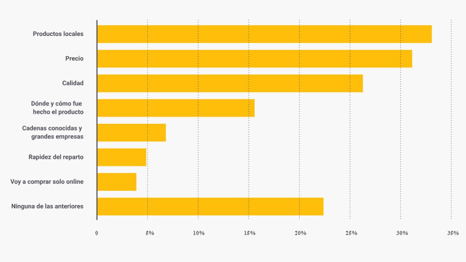 De hecho, el 34% seguirán comprando productos locales después de la Covid-19. El 16% valorará, además, el sitio donde ha sido fabricado el producto.