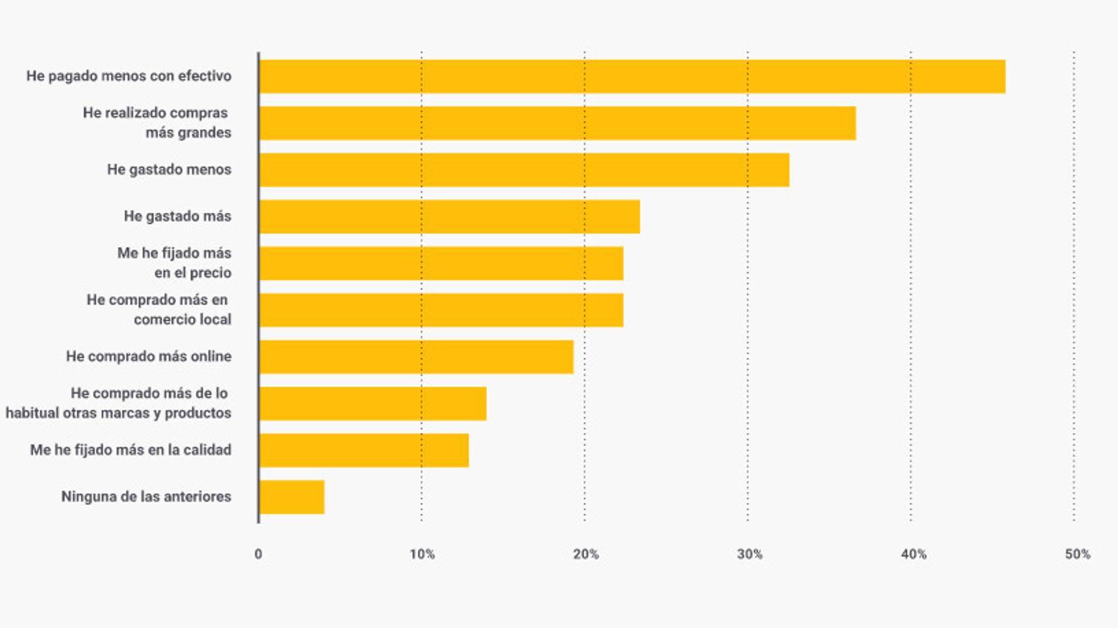 Asimismo, las recomendaciones gubernamentales y de los principales comercios a la hora de pagar más con tarjeta y menos con dinero en efectivo por cuestiones de seguridad se han asumido en muchos casos. El 45% de los encuestados han pagado menos con efectivo y, además, ha realizado compras más grandes durante estos meses. El precio se ha posicionado por delante de la calidad de acuerdo a las encuestas realizadas.